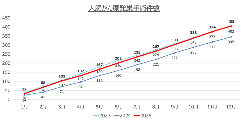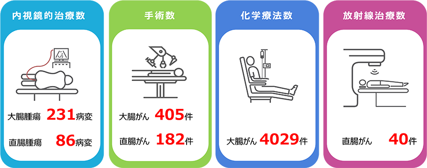 • ・手術数:大腸がん 405件、直腸がん 182件