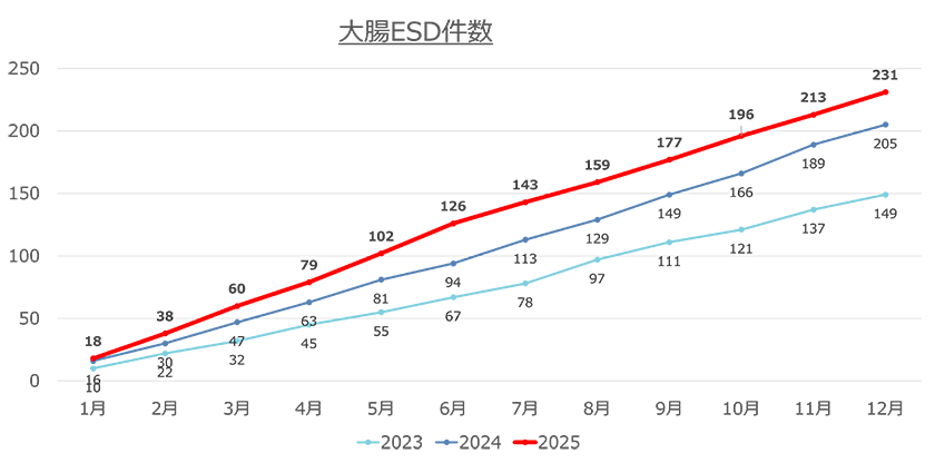 • ・内視鏡的治療(ESD)数:大腸腫瘍 231病変、直腸腫瘍 86病変