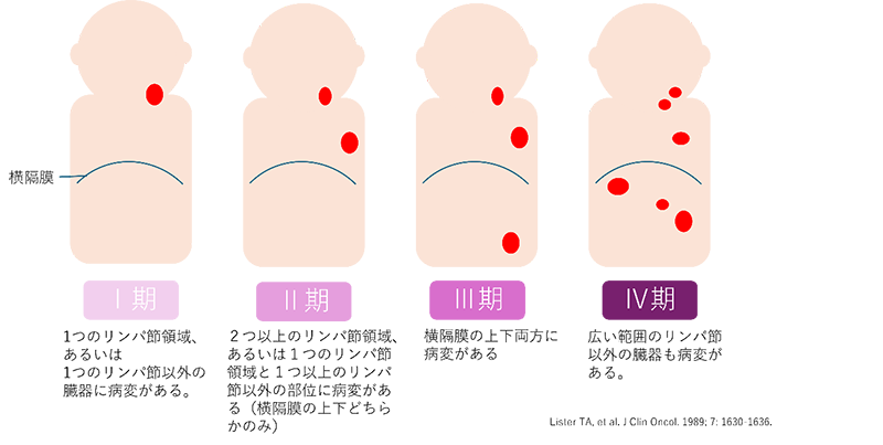 上記検査結果をもとに、次のように病期診断を行います。あくまで病変範囲の評価であり、病期によって悪性度が決まるわけではありません。