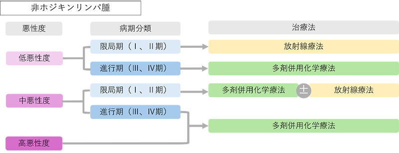 リンパ腫のタイプ(悪性度、組織型)、リンパ腫の広がり(病期)や症状の有無、患者様状態(体力、既往症、治療中の病気など)から治療方針を決定します。